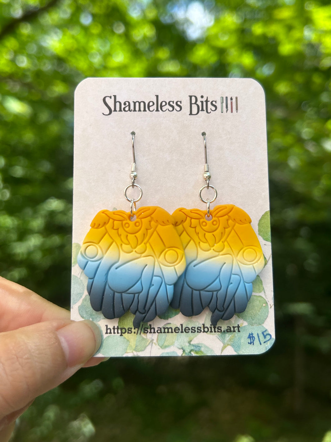 Pair of aroace pinup moth person themed earrings on stainless steel hooks and findings. Each pair is handmade in polymer clay and as such each is completely unique. As they are handmade there may be small nicks and uneven bits adding to the one of a kind quality.