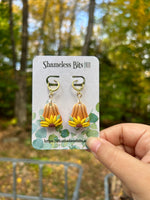 Pair of sunflower pumpkin themed earrings on 14k gold filled huggies and findings. Each pair is handmade in polymer clay and as such each is completely unique. As they are handmade there may be small nicks and uneven bits adding to the one of a kind quality.
