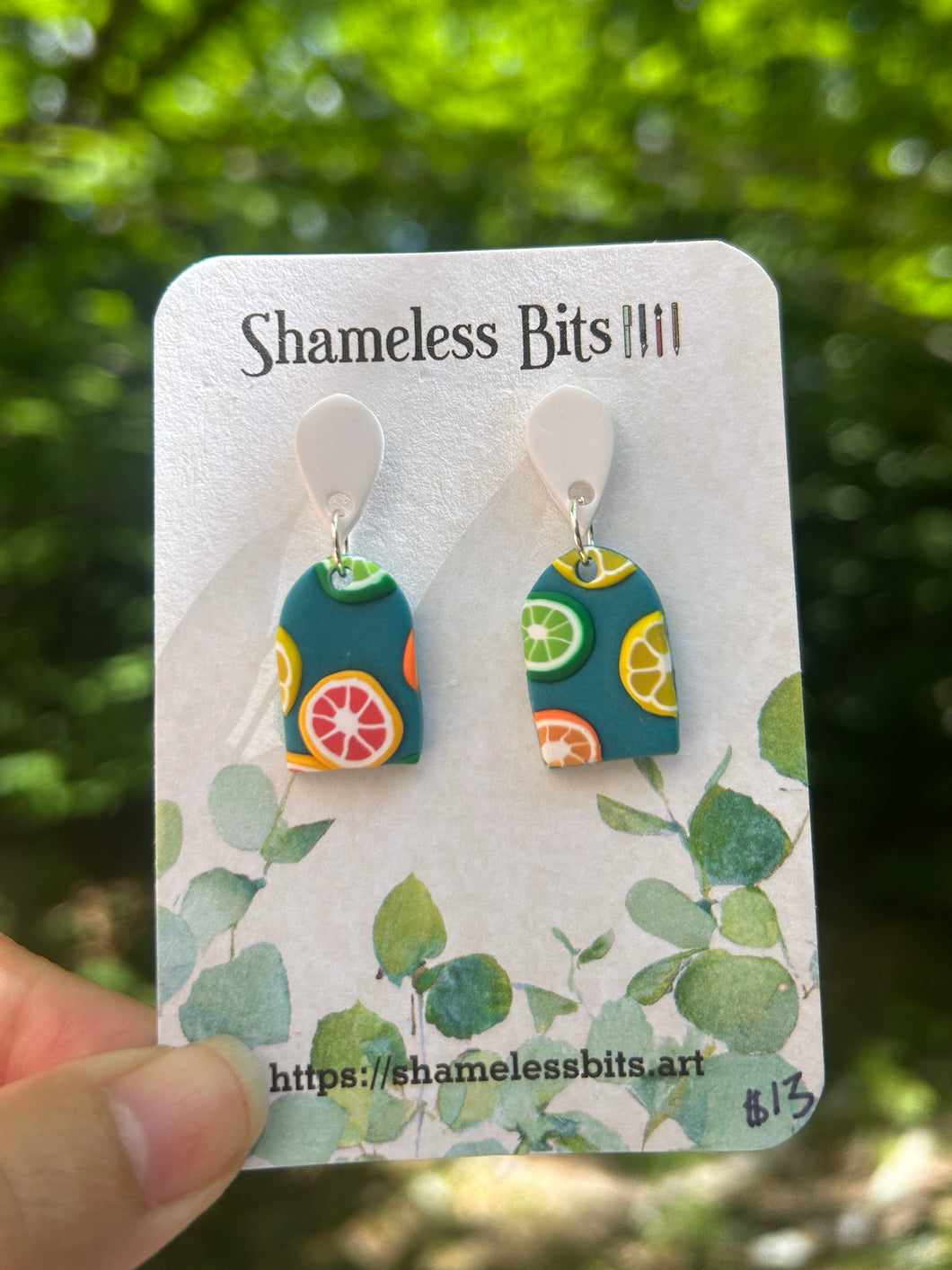 Pair of citrus themed earrings on stainless steel studs. Each pair is handmade in polymer clay and as such each is completely unique. As they are handmade there may be small nicks and uneven bits adding to the one of a kind quality.