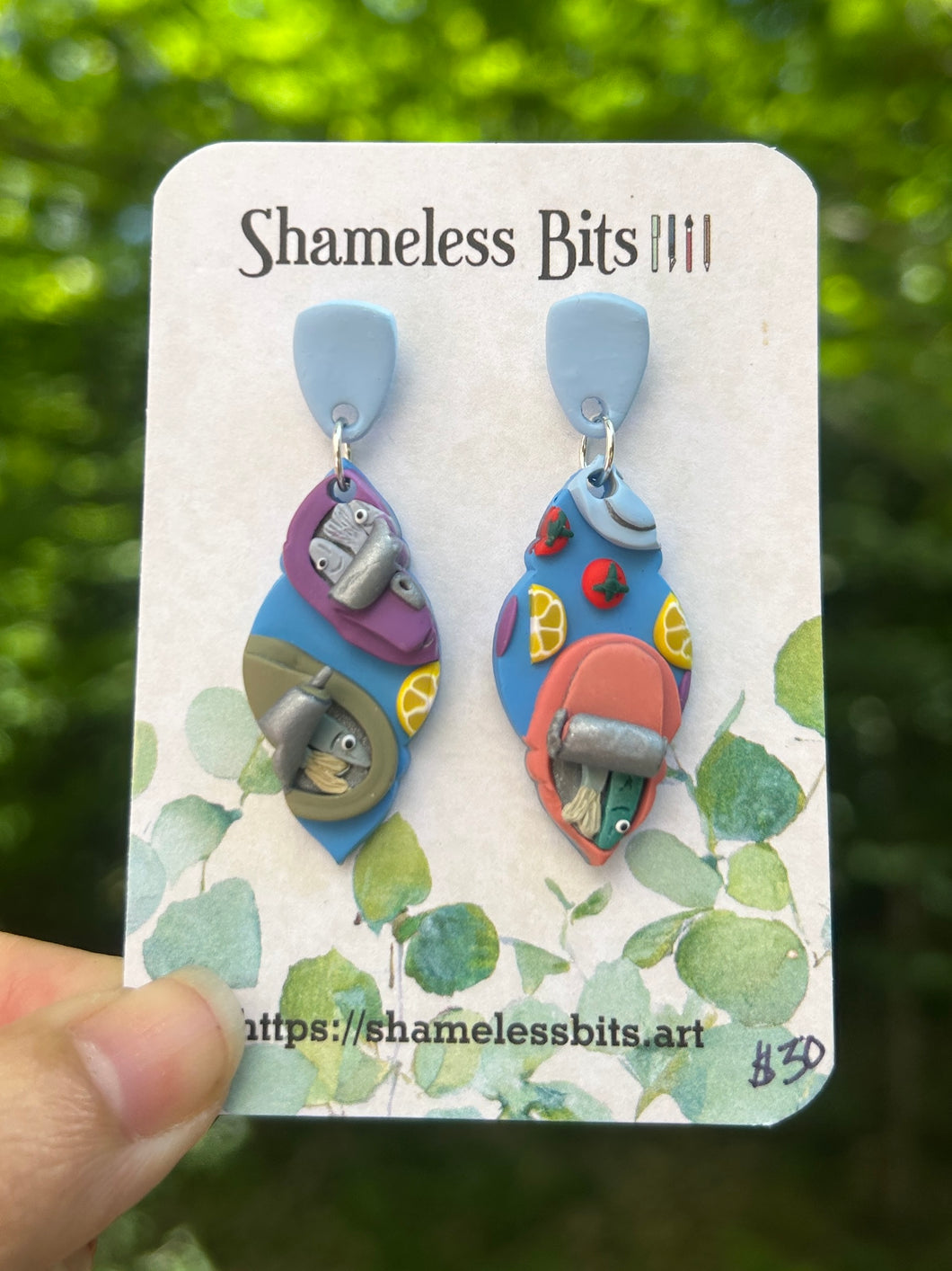 Pair of tinned sardine themed earrings on stainless steel studs. Each pair is handmade in polymer clay and as such each is completely unique. As they are handmade there may be small nicks and uneven bits adding to the one of a kind quality.