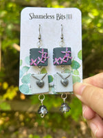 Pair of lilac and locket themed earrings on stainless steel hooks and findings. Each pair is handmade in polymer clay and as such each is completely unique. As they are handmade there may be small nicks and uneven bits adding to the one of a kind quality.