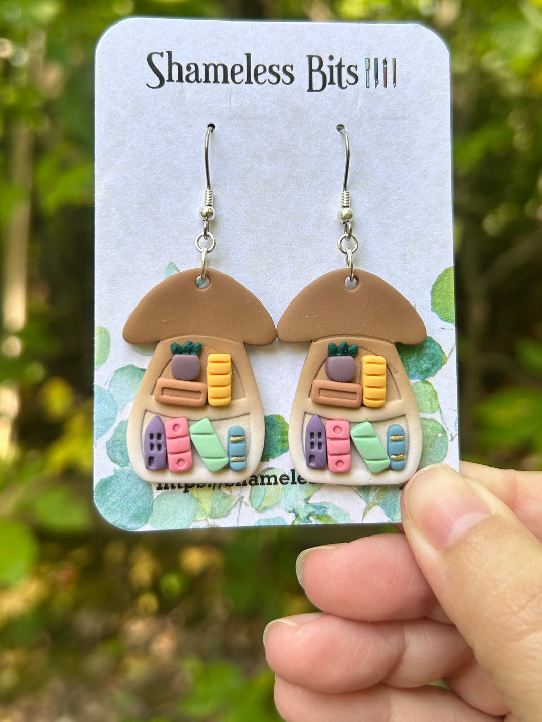 Pair of bolete mushroom bookshelf themed earrings on stainless steel hooks and findings. Each pair is handmade in polymer clay and as such each is completely unique. As they are handmade there may be small nicks and uneven bits adding to the one of a kind quality.