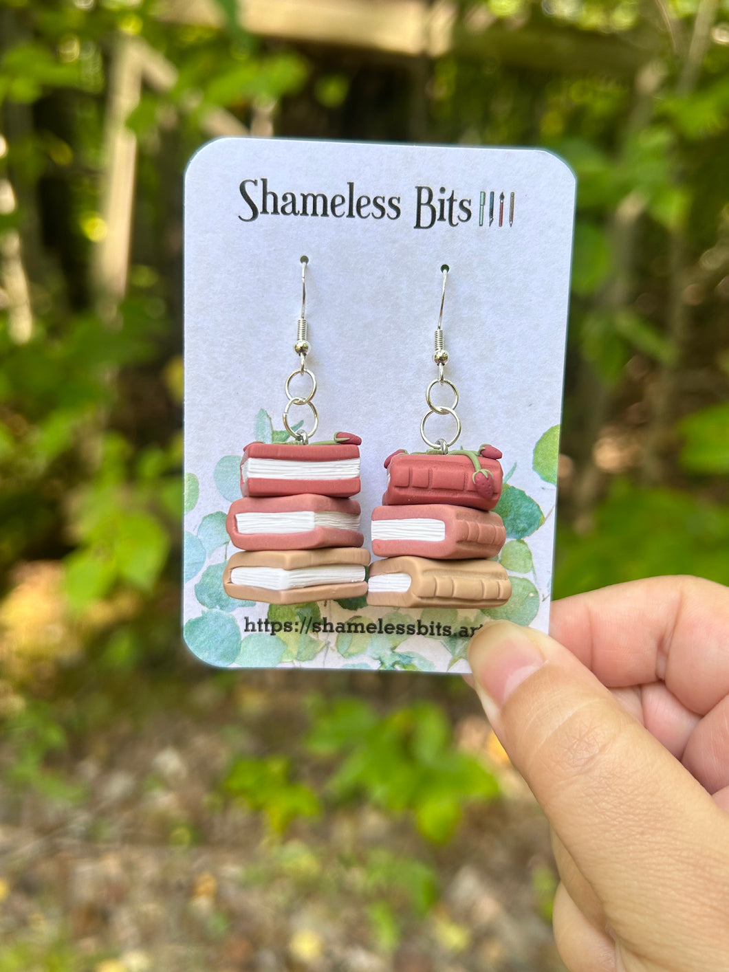 Pair of strawberry bookstack themed earrings on .925 sterling silver plated hooks and findings. Each pair is handmade in polymer clay and as such each is completely unique. As they are handmade there may be small nicks and uneven bits adding to the one of a kind quality.