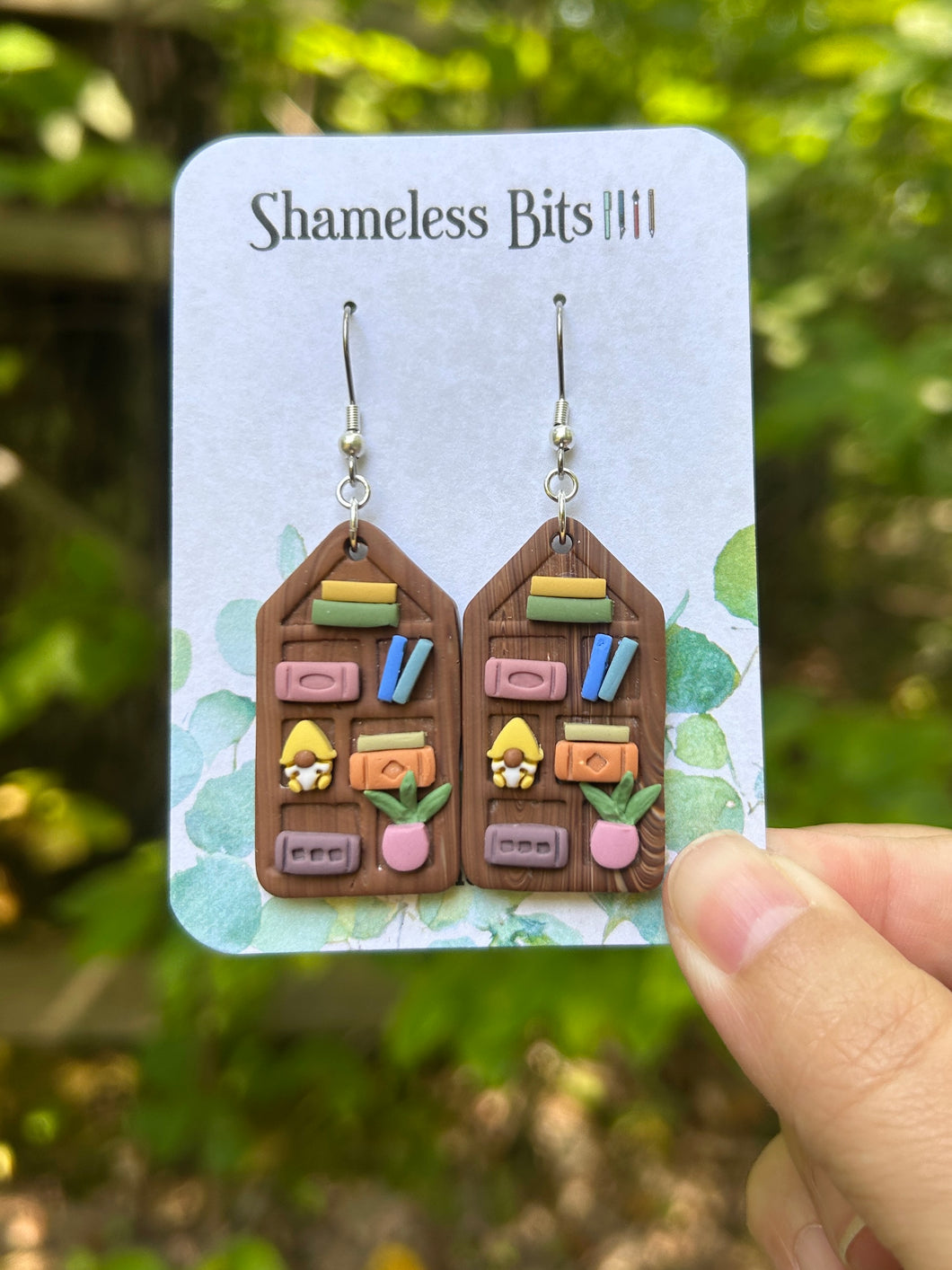 Pair of wooden bookcase themed earrings on stainless steel hooks and findings.  Each pair is handmade in polymer clay and as such each is completely unique. As they are handmade there may be small nicks and uneven bits adding to the one of a kind quality.
