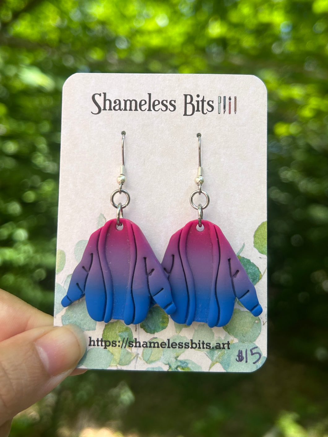 Pair of bisexual cardigan themed earrings on stainless steel hooks and findings. Each pair is handmade in polymer clay and as such each is completely unique. As they are handmade there may be small nicks and uneven bits adding to the one of a kind quality.
